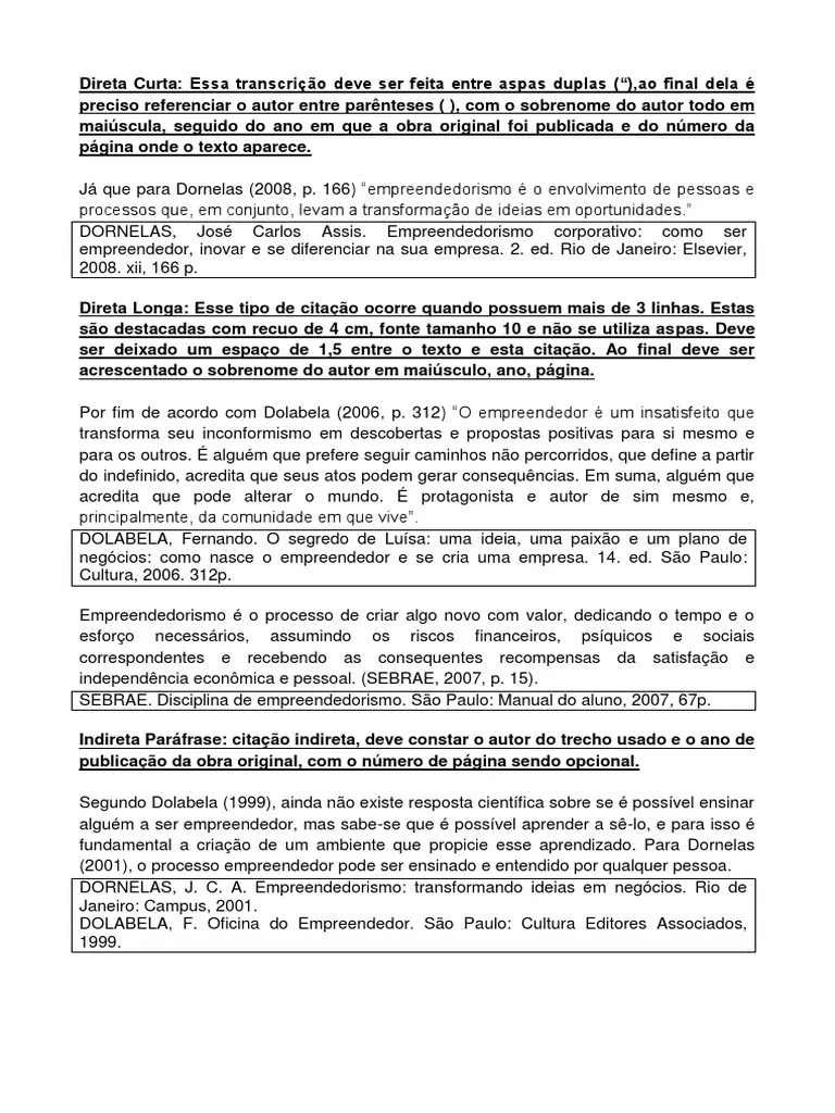 Margens esquerda e superior com 3,0 cm; Isso gera mais respaldo e confiabilidade, visto que o leitor poderá ver que a sua pesquisa científica não foi escrita a partir somente de "ideias", e sim de teoria comprovada por autores renomados. Para os títulos são aceitas fontes 12 ou 14 sendo preferível usar a 14 já que isso melhora a estética do trabalho. Citação curta (até 3 linhas) deve ser inserida no texto, entre aspas. De acordo com o tamanho da citação direta, você terá uma formatação específica para ela, neste exemplo vou demonstrar como formatar as citações diretas longas, que são as que possuem mais de 3 linhas. Direita e inferior com 2,0 cm. A citação direta é a transcrição, na íntegra, da parte do texto de um autor para embasar a sua pesquisa. A indicação da página é obrigatória. 28.10.2019 · a citação direta longa é inserida no trabalho através de um "bloco" separado do restante do texto, como se fosse um parágrafo de destaque. Para citações com mais de 3 linhas há uma regra específica determinada pelas normas abnt.